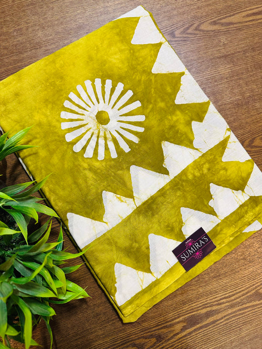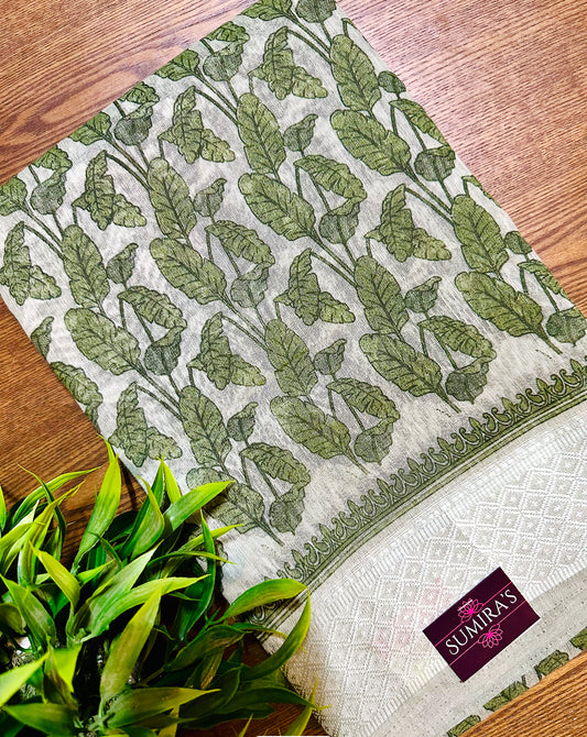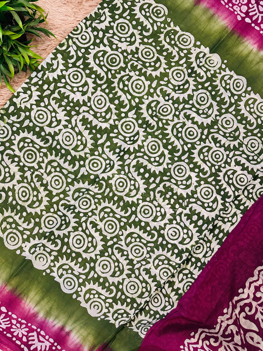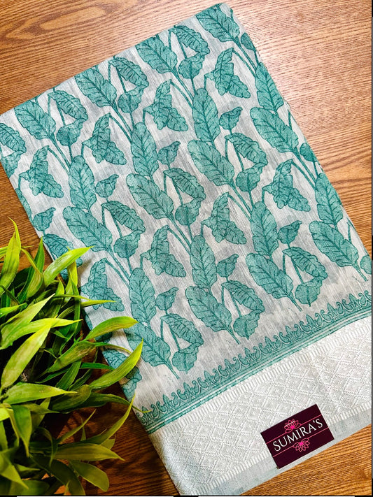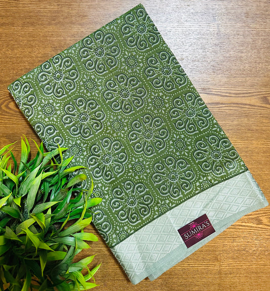 Leaf Green Mul Cotton Hand Block Printed Saree