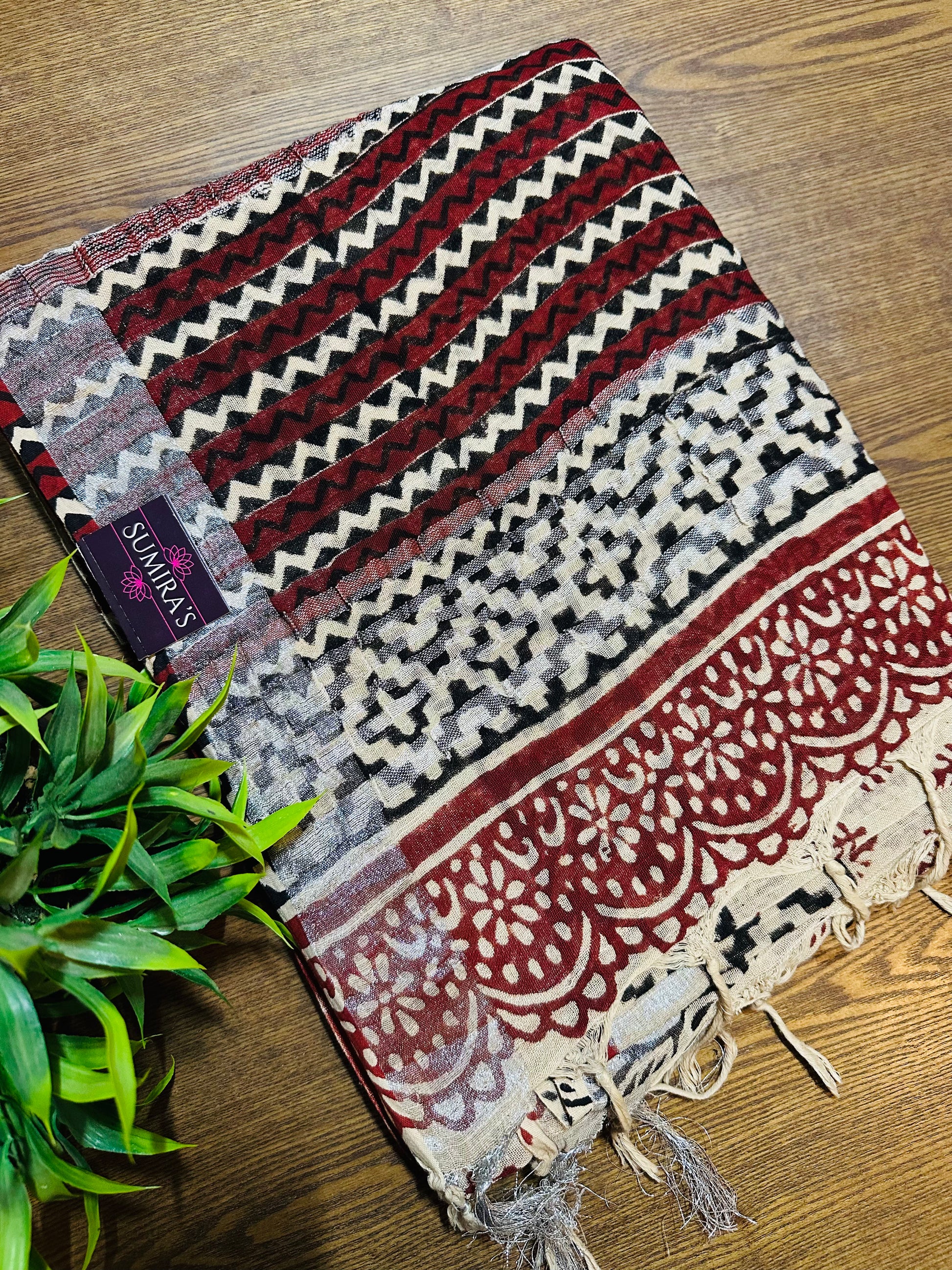 Beat the heat in style with our pure linen saree, featuring a chic leaf print and an elegant zari border. Crafted from 100% pure linen, this saree offers unmatched softness, effortless draping, and all-day comfort. Adorned with handblock prints and natural dyes, it’s the perfect blend of fashion and breathability for a cool summer look.