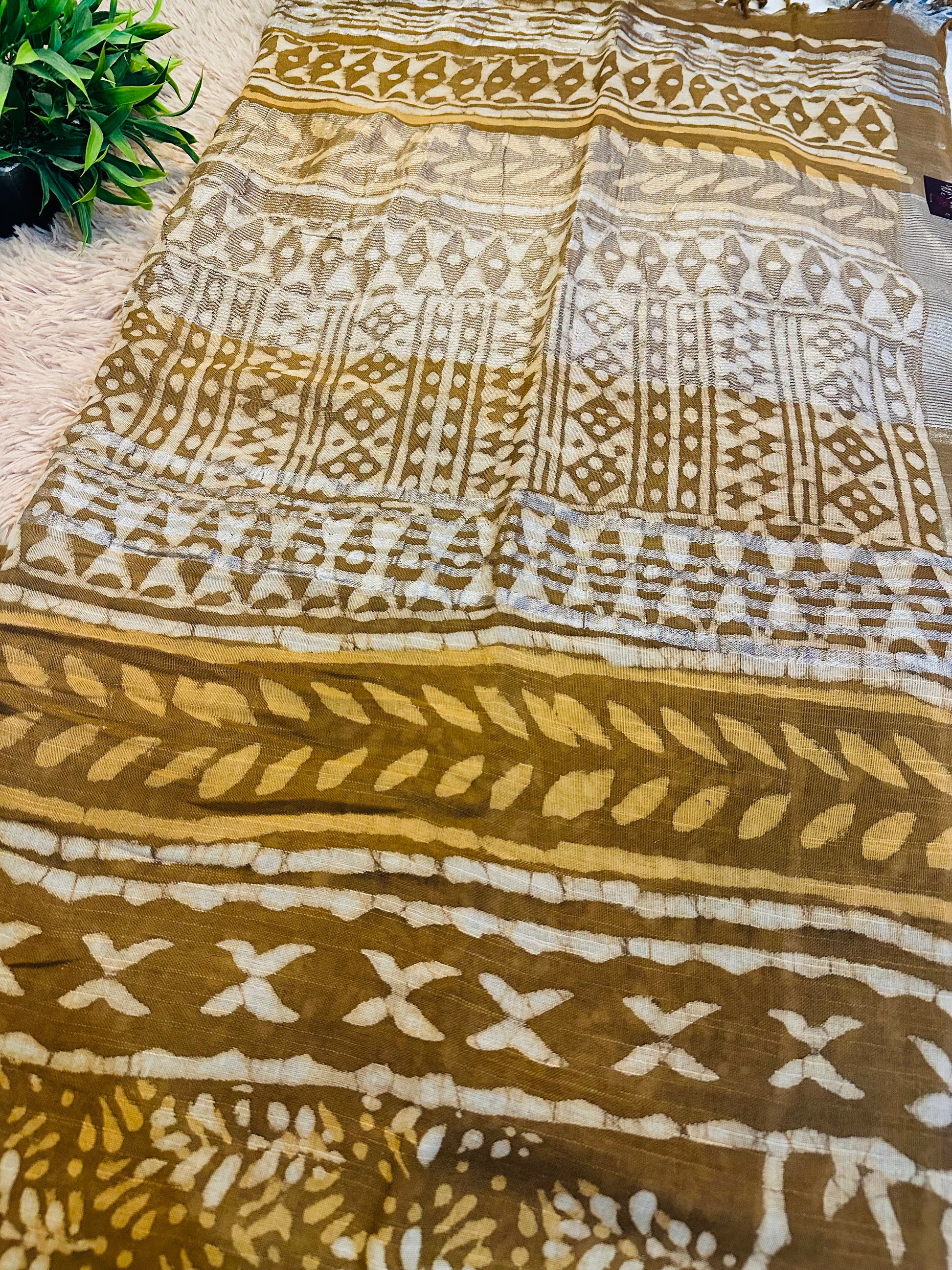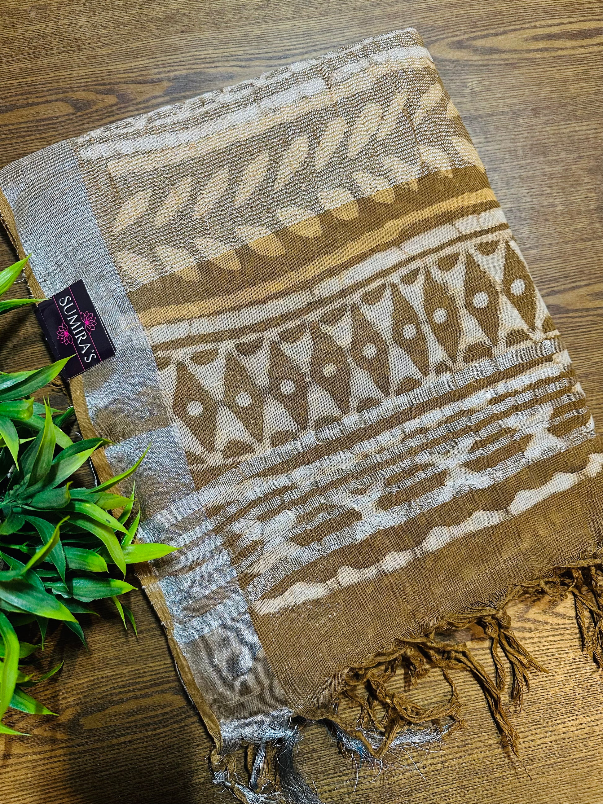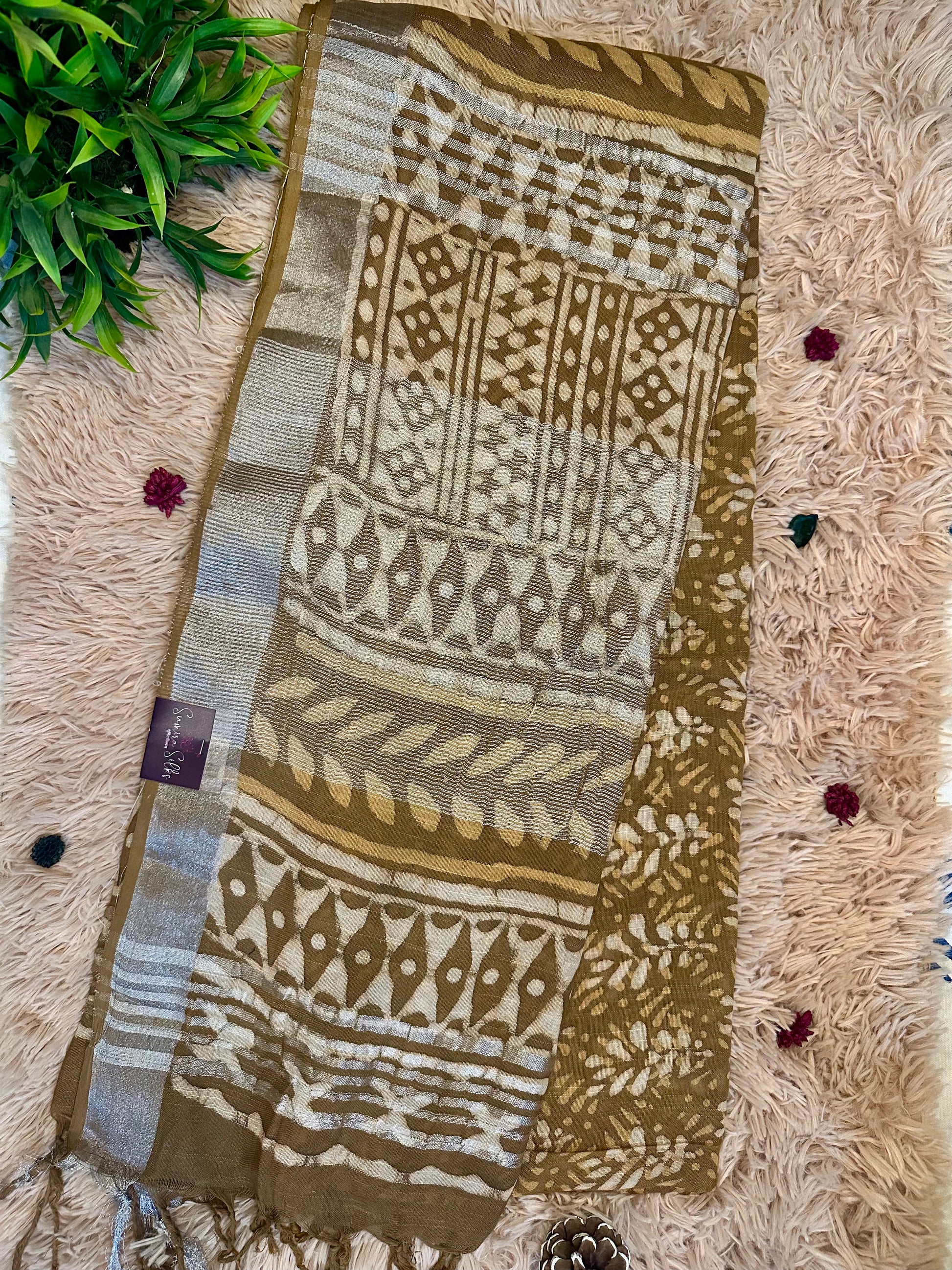 Beat the heat in style with our pure linen saree, featuring a chic Leaf print and an elegant zari border. Crafted from 100% pure linen, this saree offers unmatched softness, effortless draping, and all-day comfort. Adorned with handblock prints and natural dyes, it’s the perfect blend of fashion and breathability for a cool summer look.