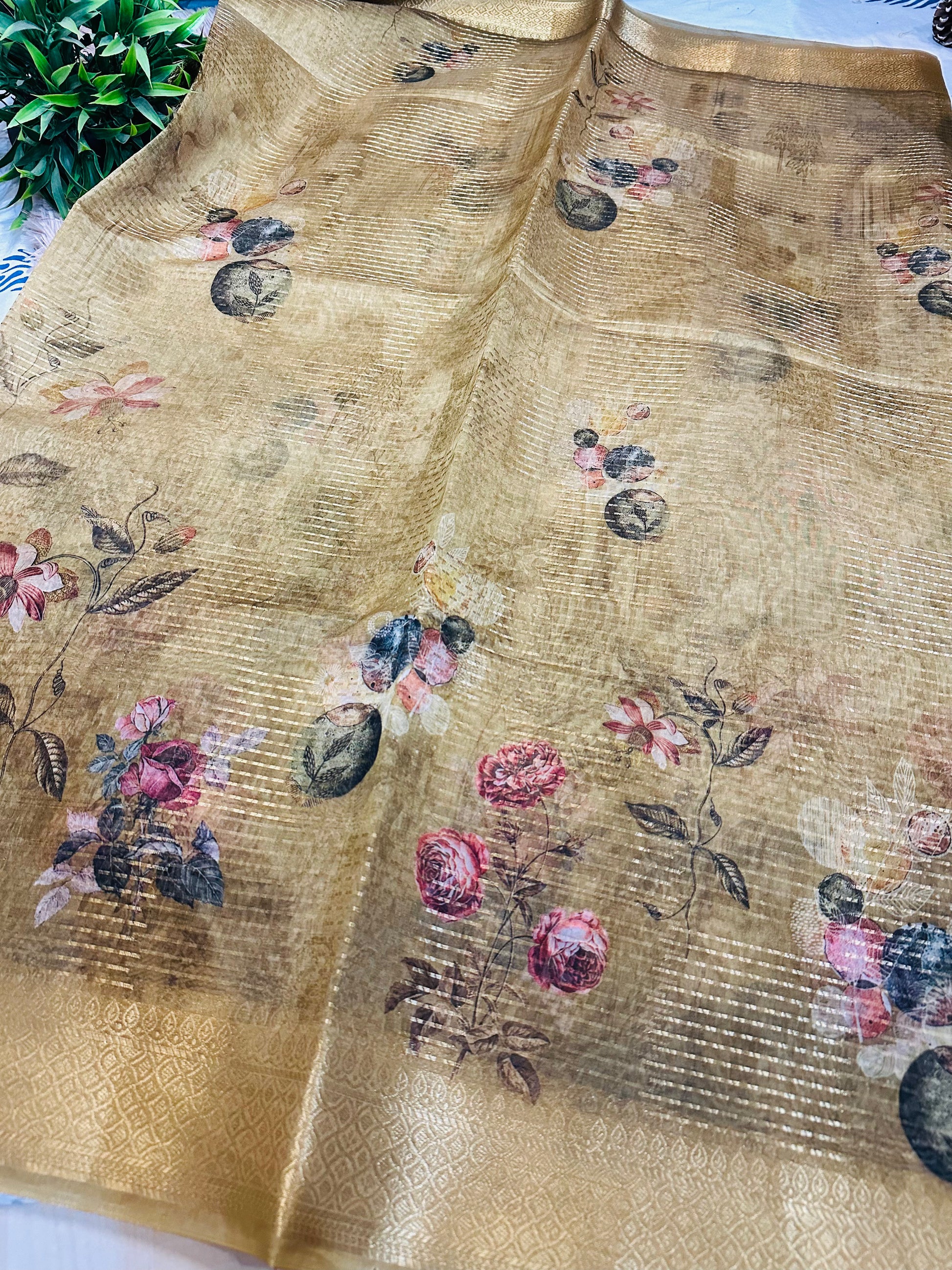 Effortlessly elegant and versatile, this Tissue Silk Saree features a stunning digital print and intricate zari detailing throughout. The luxuriously lightweight and soft fabric makes it perfect for any occasion, while the broad border adds an extra touch of charm. Easy to drape and suitable for all seasons, this saree is a must-have for any wardrobe.