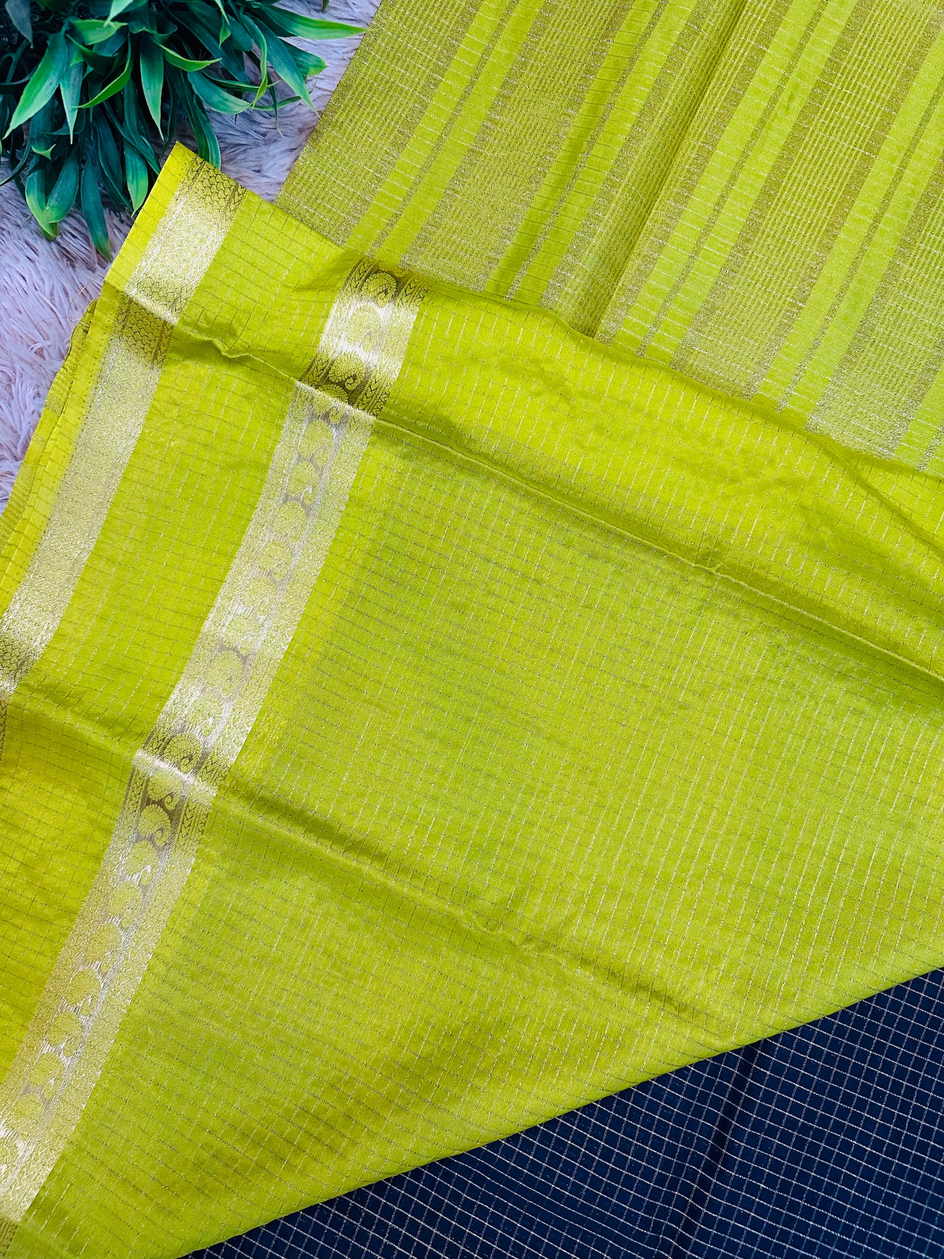 This Semi Mysore Crepe Silk Saree is designed with zari Checks all over, and features a beautiful mango zari Border. It comes with a blouse piece for a complete look and is perfect for any occasion or festive wear. The saree is not only easy to drape, but also comfortable to wear.